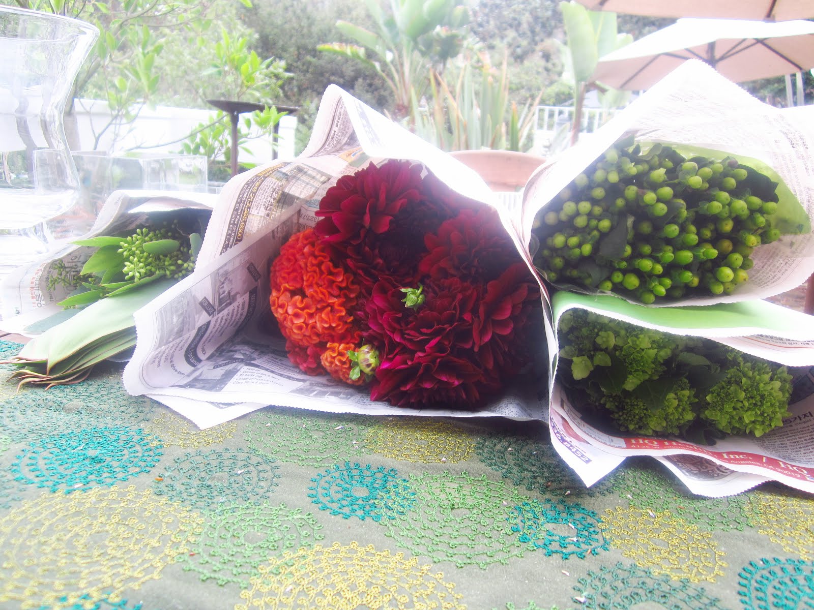 Anyhooo...needless to say...I pulled an assortment of flowers and greenery and brought it home...plopped it on my deck dining table and started cutting and snipping. I got Dahlias, Cockscomb, Baby Hydrangea, Seeded Eucalyptus, Coffee Beans, Tea Leaves...I had only ever bought hydrangea, tea leaves and coffee beans for arrangements in the past...so this was all new to me.